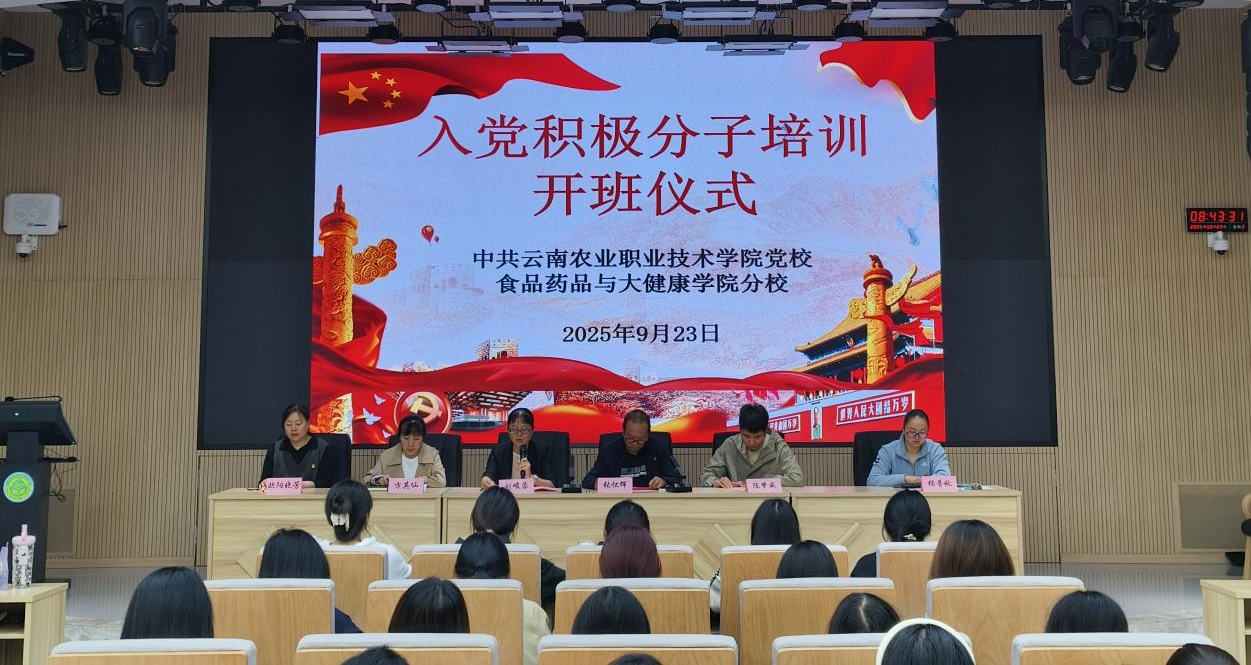 为深入学习贯彻习近平新时代中国特色社会主义思想,扎实推进入党积极分子培养教育工作,引导他们端正入党动机,2025年9月23日上午,中共云南农业职业技术学院委员会党校食品药品与大健康学院分校在综合楼阶梯教室举行了2024级入党积极分子培训开班仪式,食品药品与大健康学院党总支书记刘峻蓉、党总支宣传委员兼统战委员教工支部书记张怀辉、总支委员方其仙、学校党委组织部副处级组织员兼副部长欧阳晓芳、学生支部书记陈梦威、党务工作人员杨普秋及75名积极分子参加开班仪式,开班仪式由杨普秋主持。