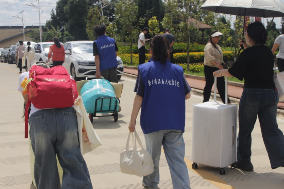 校门口的志愿者们积极的帮助新生托运行李、引导路线送达宿舍,在途中热心的回答新生问题,提醒他们一些注意事项,帮助他们熟悉学校的环境,希望为他们的大学生活开一个好头。