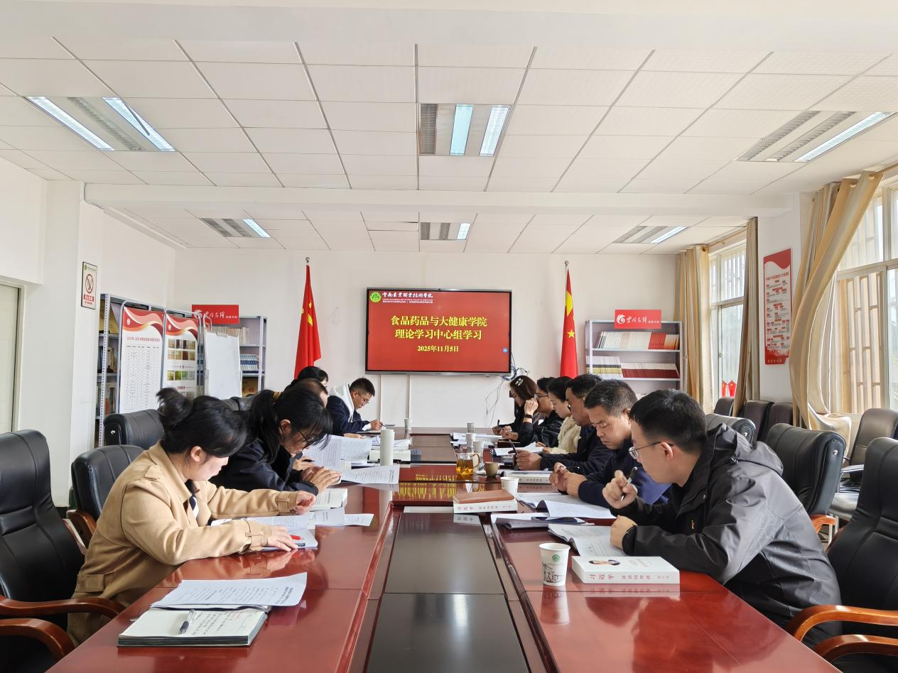 2025年11月5日下午,食品药品与大健康学院党总支在小哨校区综合楼217会议室召开第七次理论学习中心组(扩大)学习会。专题开展党的二十届四中全会精神与《习近平谈治国理政》第五卷学习研讨。会议由学院党总支书记刘峻蓉主持,党总支理论学习中心组全体成员参加,学院相关部门负责人、巡察组部分成员列席会议,列席旁听工作组第五组组长姚廷超副校长带队全程旁听本次学习,并在研讨环节结束后作点评指导。