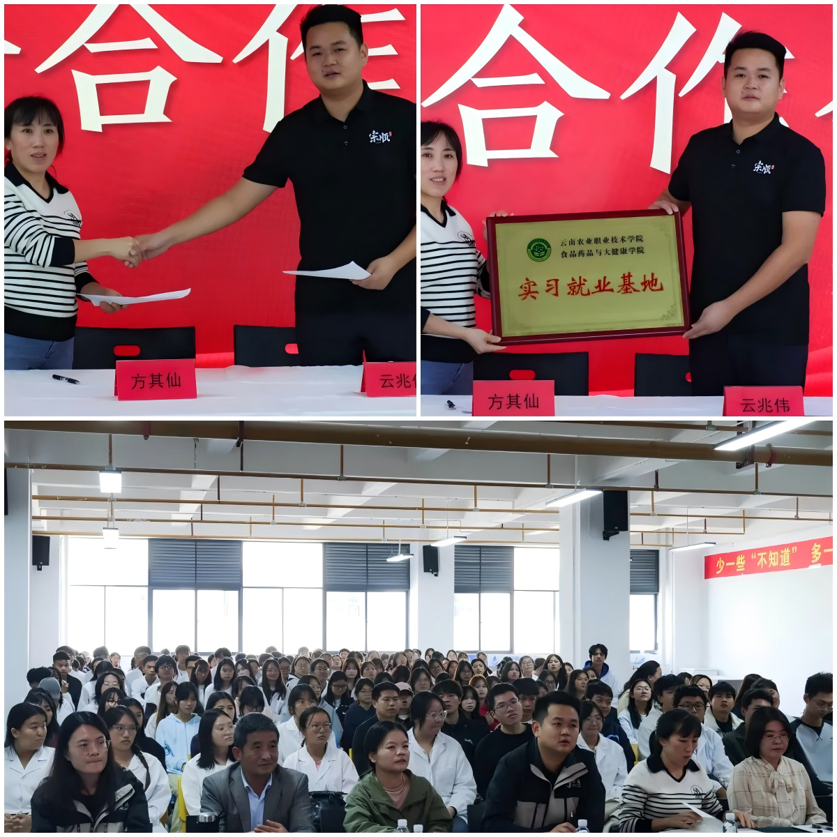 为深化产教融合、拓宽学生实习就业渠道,响应“访企拓岗促就业”行动要求,2025年10月29日,由食品药品与大健康学院方其仙副院长率队,师生一行200余人赴昆明市高新区马金铺保税物流园,走进宗顺集团(云南宗顺生物科技有限公司、云南云子药业有限公司、云南宗顺中药材开发有限公司)开展综合实践活动,并隆重举行校企合作签约暨授牌仪式。