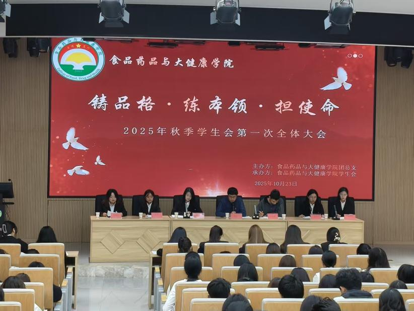 为深入贯彻落实学生会组织建设要求,切实提升学生干部队伍整体素质,10月23日,以"铸品格·练本领·担使命"为主题,食品药品与大健康学院于综合楼阶梯教室组织召开2025年秋季学期学生会第一次全体大会。