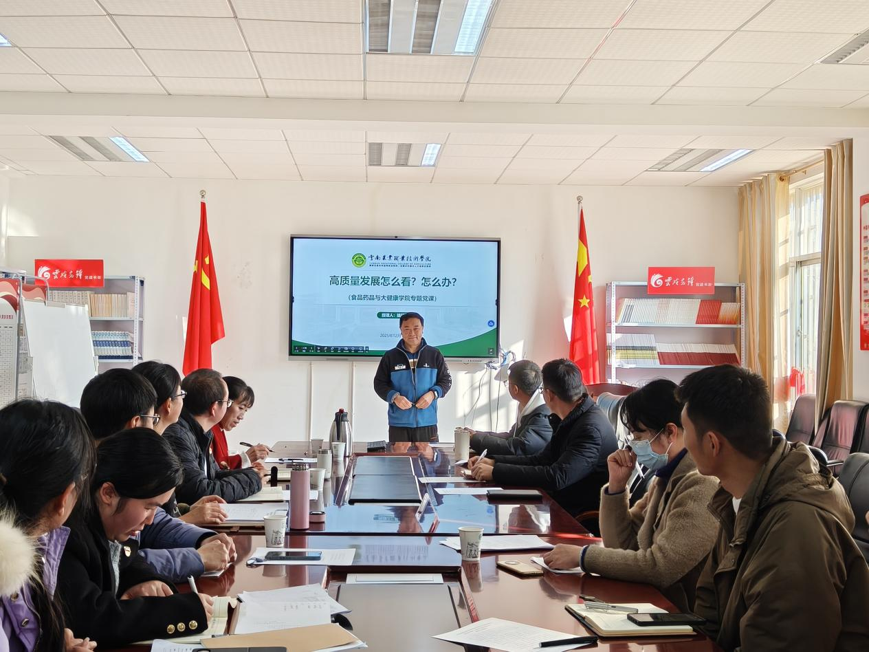 2025年12月17日下午,食品药品与大健康学院党总支在综合楼217会议室召开全体教师党员大会,校党委委员、副院长姚廷超以“高质量发展怎么看?怎么办?”为主题讲授专题党课。
