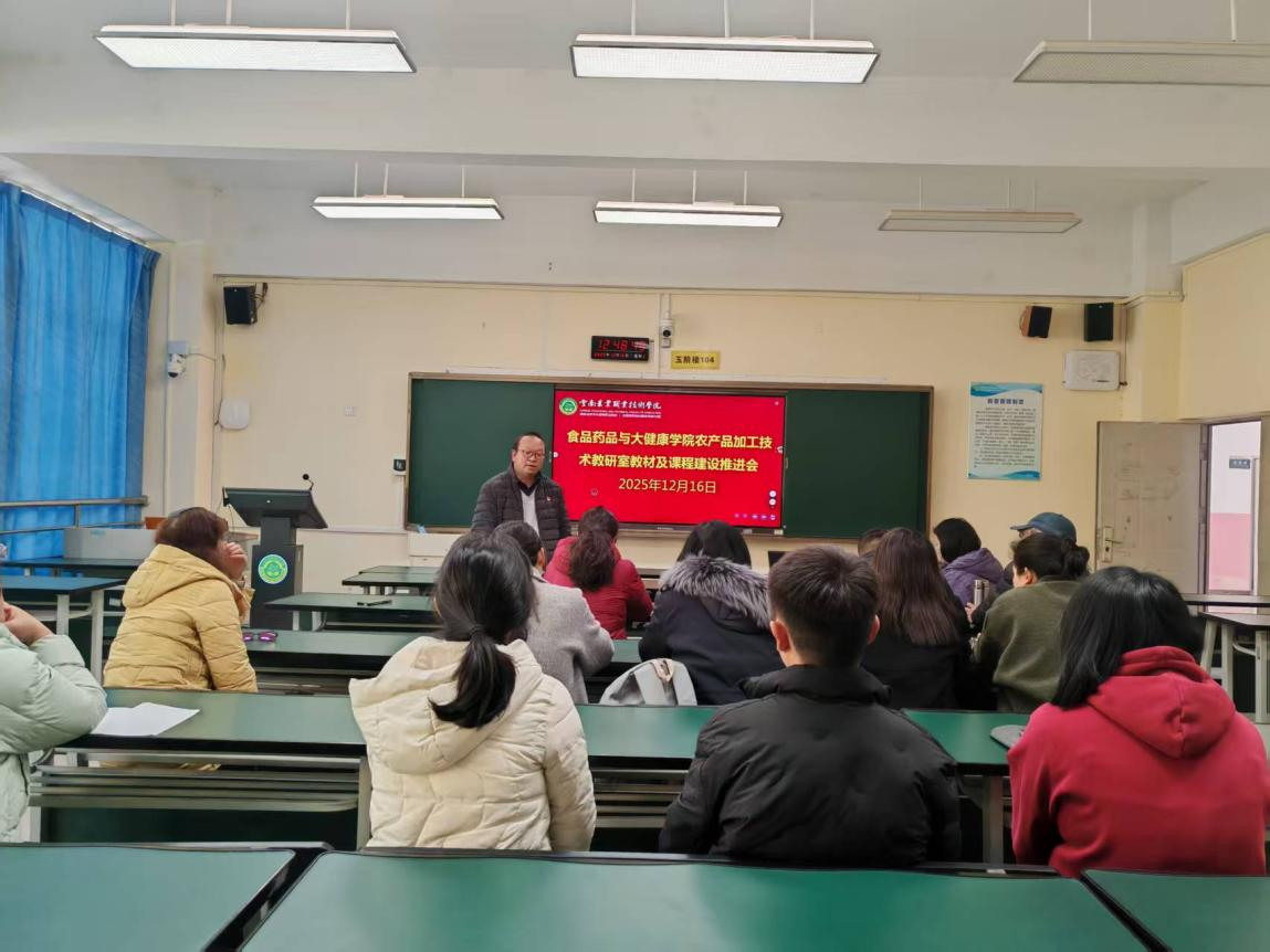 12月16日,食品药品与大健康学院食品质量与安全教研室和农产品加工技术教研室联合召开教材及课程建设推进会。会议紧扣学校“食品安全与质量”“现代农业技术”两个省级“双高”专业群建设任务,统筹部署2026年校级规划教材及重点课程建设项目申报工作,学院党总支书记刘峻蓉、院长张怀辉及教研室全体教师参会。