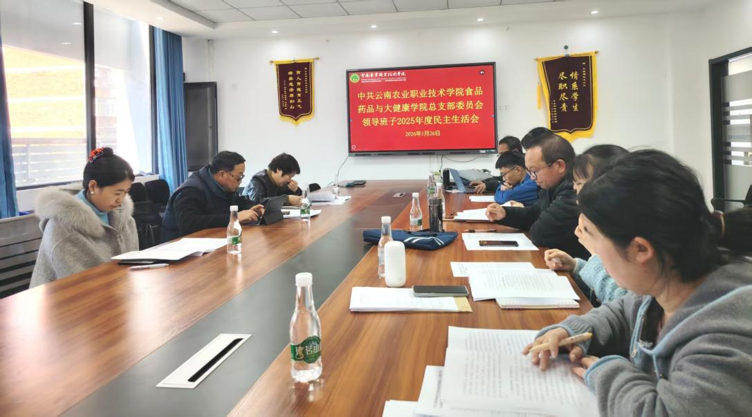 2026年1月26日14:30,食品药品与大健康学院党总支在茭菱校区办公楼C202会议室召开2025年度民主生活会。会议以深入学习贯彻习近平新时代中国特色社会主义思想,全面贯彻落实党的二十届四中全会精神,锲而不舍落实中央八项规定精神为主题,以打攻坚战、持久战的决心和恒心,推进作风建设常态化长效化,以优良作风凝心聚力、真抓实干为抓手,推动学院各项工作取得新成效和实效。